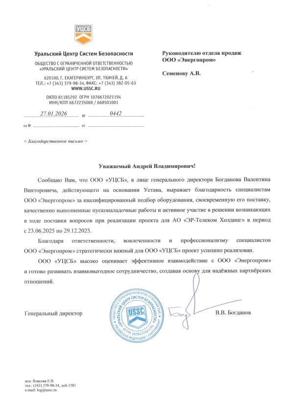 ООО «УЦСБ» выражает благодарность специалистам ООО «Энергопром» за квалифицированный подбор оборудования, современную его поставку, качественно выполненные пусконаладочные работы и активное участие в решении возникающих в ходе поставки вопросов по реализации проекта для АО «ЭР-Телеком холдинг».